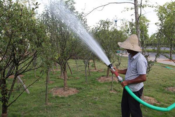 木本花卉根系入土深,分布面廣,吸水力強,澆水量可適當(dāng)少些。